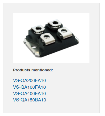 The Vishay Semiconductors rectifier modules released today consist of the dual-diode 100 A VS-QA100FA10, 200 A VS-QA200FA10, and 400 A VS-QA400FA10 in parallel configurations, and the 150 A single phase bridge VS-QA150BA10. With their industry-standard SOT-227 package, the devices can be used as drop-in replacements for competing solutions to increase efficiency.